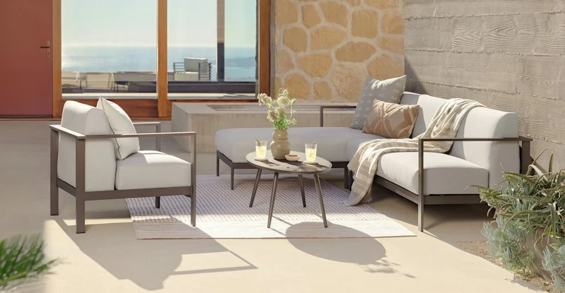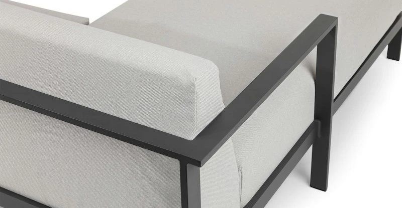 Sit back and relax. Designed with a thick, exposed powder-coated aluminum frame and an ergonomic design sensibility, the Burkel has got your back. Featuring firm seat and back cushions with just the right amount of cush, this sectional is upholstered in a sophisticated, durable basketweave fabric that’s also abrasion-resistant and equipped with waterproof slips for extra protection against the elements.